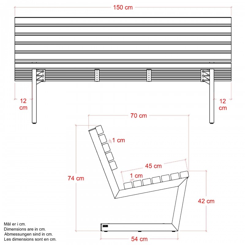 - Afmeting: lengte 150 cm x breedte/diepte 70 cm x zitdiepte 45 cm x rughoogte 74 cm