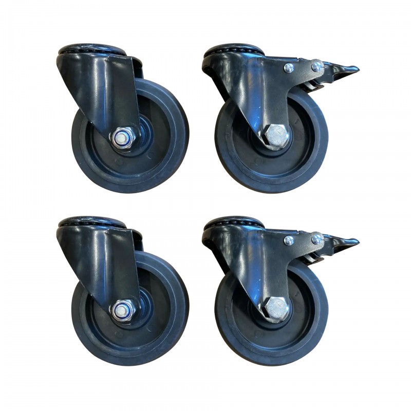 • Wielen: zwart doorsnee 100 mm, waarvan 2 met rem en 2 zonder rem.