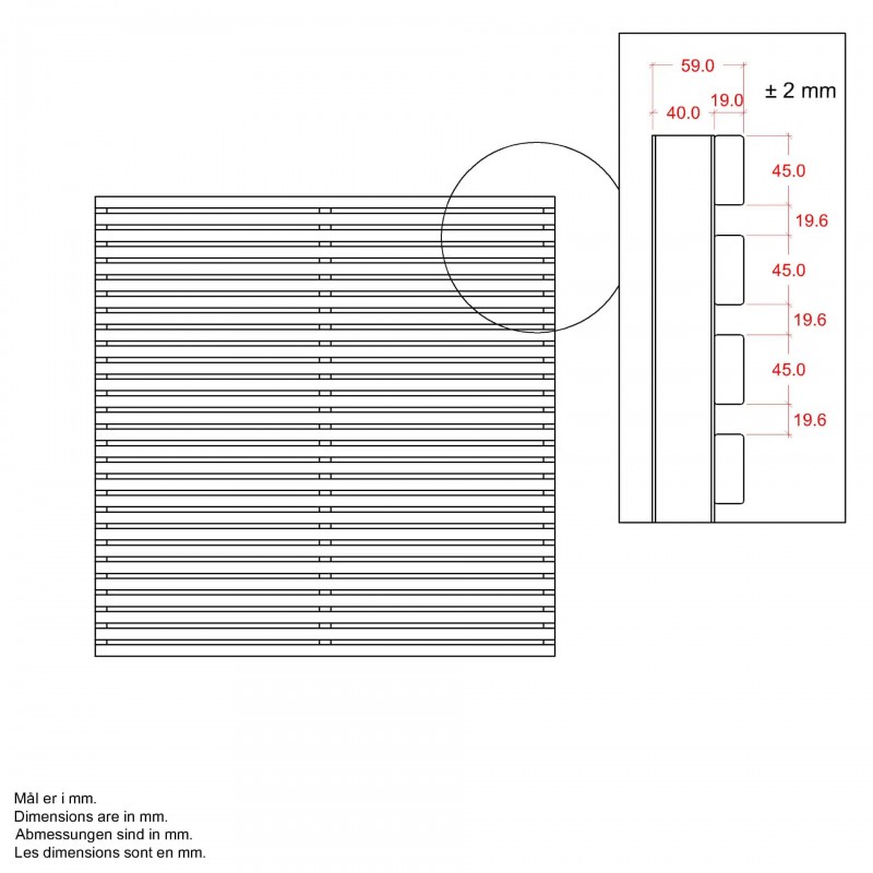 • Lamellen: 19 x 45 mm en afstand tussen de lamellen is 19,6 mm